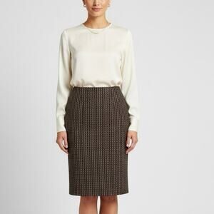 This stunning Escada pencil skirt features a rich textured fabric in brown and black tones, fully lined with a tailored silhouette. A timeless luxury piece, perfect for pairing with silk blouses, blazers, or knits. Ideal for career, office wear, or elevated business casual looks.