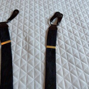 The Trafalgar Men’s Suspenders in blue and purple paisley floral print with leather fittings are a stylish and sophisticated accessory for men. Designed with American, retro, and preppy themes in mind, these suspenders add a touch of old money charm to any outfit. Made from a combination of leather and fabric, these suspenders offer a luxurious feel and a timeless look that is perfect for formal events or adding a pop of color to a casual ensemble.