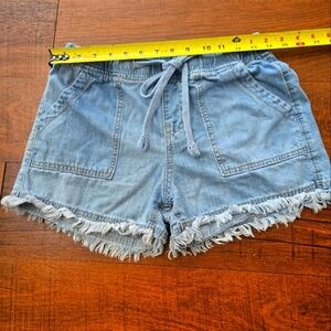 Stylish denim shorts with a frayed hem. Perfect for casual outings. Features a comfortable fit and a drawstring waist.