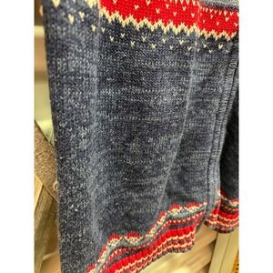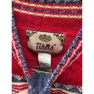 Keywords: TIARA INTERNATIONAL sweater, women's cardigan, fair isle sweater, snowflake pattern, zip up sweater, red blue sweater, cozy knitwear, winter fashion, casual sweater, vintage style sweater, nordic pattern, long sleeve cardigan, womens size small