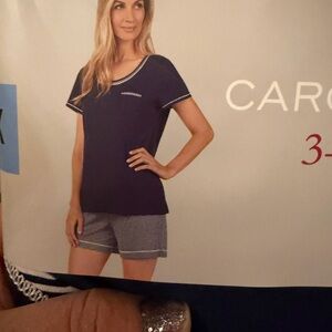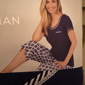 Navy and white pajama set. Includes short sleeve top, shorts, and capri pants. Comfortable and stylish.