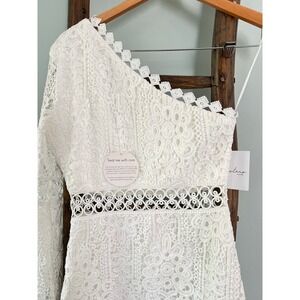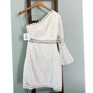 NWT Two Sisters The Label beautiful white lace one shoulder dress Size 4 Lined. Bell sleeve, side zip.
