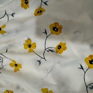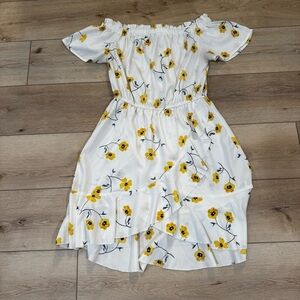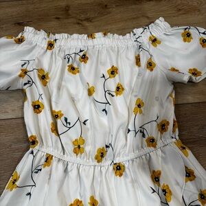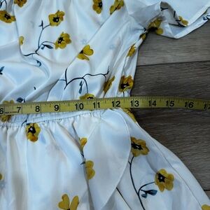 Measurements shown, 100% polyester, stretchy neckline, flare, ruffles, country western spring summer warm weather, can be paired with sneakers, sandals, heels or boots, charming off-shoulder mini dress featuring a delightful floral pattern, the white base is beautifully accented with vibrant yellow flowers, perfect for any occasion.