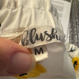 Blush white yellow & blue floral off the shoulder mini dress, faux wrap, ruffles, M.