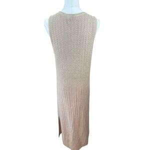 Elevate your warm-weather wardrobe with this chic tan knit maxi dress. The intricate ribbed texture creates a sophisticated, body-conscious silhouette that flows gracefully to the ankles. Designed with elegant side slits, this sleeveless dress offers both comfort and style, allowing for easy movement and a touch of allure. Perfect for a sophisticated brunch, a stylish evening out, or a luxurious vacation getaway.