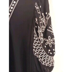 Belldini Los Angeles black tunic dress. Featuring intricate white floral embroidery on the neckline and statement blouson sleeves, this lightweight 100% rayon dress offers a relaxed, flowy silhouette.