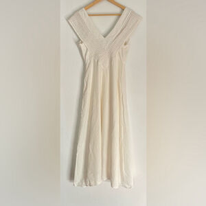 It features a beautiful V-neckline on both the front and back. It has a zipper closure on one side, ensuring a perfect fit and a flattering shape. It's sleeveless and features a comfortable cotton lining for maximum comfort. Stylish cream maxi dress with a V-neck design. Perfect for any occasion.