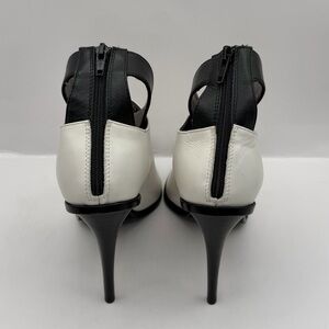 Step into luxury with these stunning Tibi New York Abbie Colorblock Booties. Expertly crafted in Italy, these heels feature a sophisticated black and white leather design with a modern peep-toe silhouette. The functional rear zipper closure and elegant stiletto heel make them a standout piece for any designer collection.