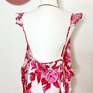 Pink and red floral slip dress. Flutter sleeve. Adjustable traps. Side slits.