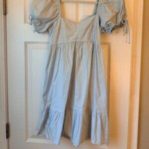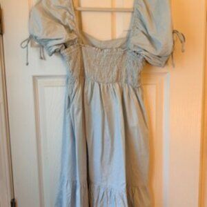 Never worn light blue knee length dress with smocked back stretch and puff sleeve detail. Would be best for a smaller bust.