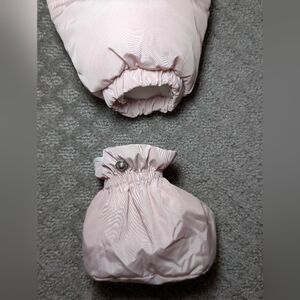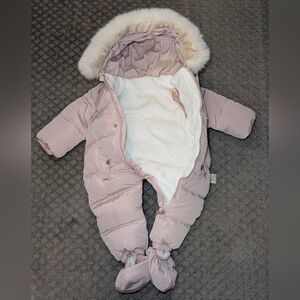 Adorable pink snowsuit for babies by Murmurbear. Features a cozy hood with detachable faux fur trim, gloves and detachable snap footies/booties.