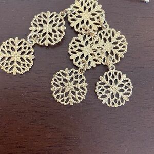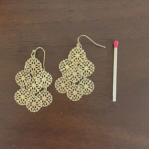 Gold toned chandelier earrings. My guess is they are Stella and Dot, but unfortunately I don’t remember for sure! Material unknown. Super lightweight and easy to wear