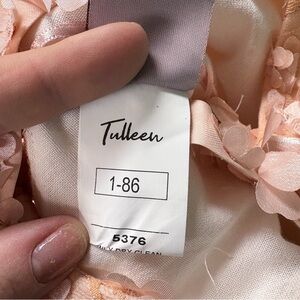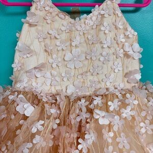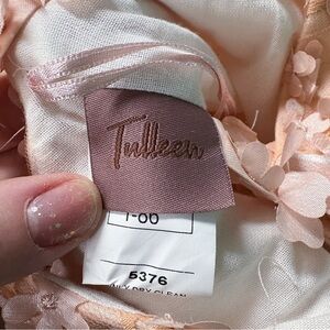 Beautiful and elegant Tuleen Dahlia Floral Dress in a soft peach color. This stunning dress features delicate 3D floral appliqués throughout with layers of airy tulle that create a full, whimsical skirt. The sleeveless design with straps offers a comfortable and flattering fit, perfect for special occasions.