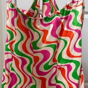 Bright dress with swirling patterns. Features pink, green, and orange tones. Like new with keyhole halter neck! Size small. The back has some stretch to it around the bra area.