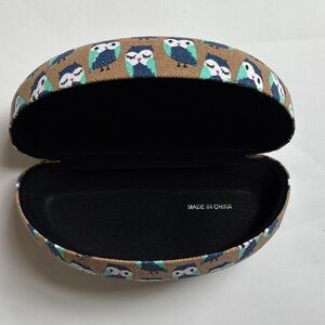 Charming glasses case with owl pattern. Features brown, blue, and green colors.