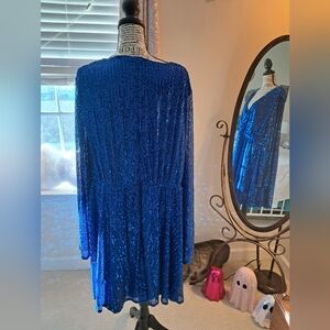 Stunning blue sequin dress with a V-neckline and long sleeves. Perfect for special occasions.