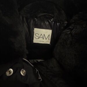 Chic and cozy black puffer with faux fur stand collar, zip pockets and zip front with snap closure. Warm, sleek and easy to style.