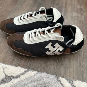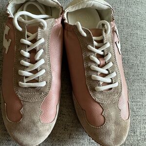 Chic Tory Burch sneakers in pink and cream. Features iconic logo detail. Soft calf leather and suede. Excellent condition, like new, never worn.