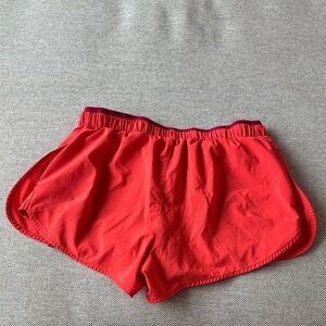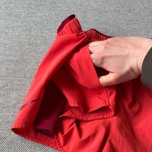 Bright coral color, wine colored spandex like liner. Flowy open sides with small pockets.