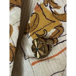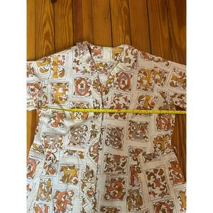 This handmade vintage 50s day dress in size L features a feminine rockabilly look with gold cream letters, perfect for a retro-inspired occasion. Made of cotton, this original piece exudes a classic 1950s style with a hint of house dress charm. The dress has a regular fit with a chest and waist size of 40, making it a unique addition to any woman's vintage clothing collection. Bus is 40 inches. Waist is 40 inches. And the length is 42 inches. Missing belt.