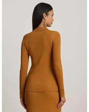 Lauren Ralph Lauren Rib-Knit Long-Sleeve Polo Cardigan in a beautiful ochre/mustard yellow. This sophisticated piece features a classic spread collar and full button-front closure, allowing you to wear it as a top or a lightweight cardigan layers.