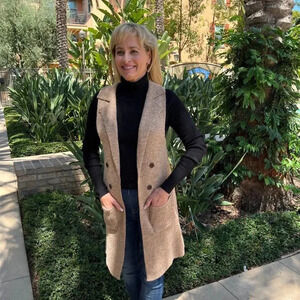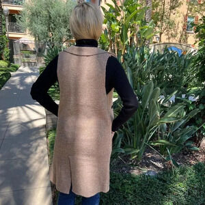New, Long Sweater Vest Heather Camel Khaki/Brown Open Front Pockets Cozy Soft, short sleeve.