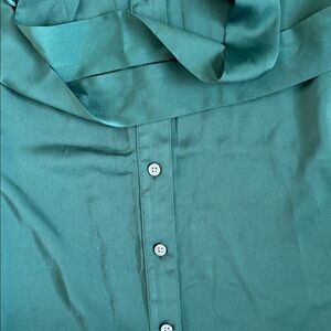 Maxi long-sleeve shirtdress in forest green. Size is XXS Petite. Material is soft and satiny. Features button-down front with a tie-waist belt (built in loops for convenience).