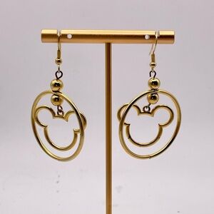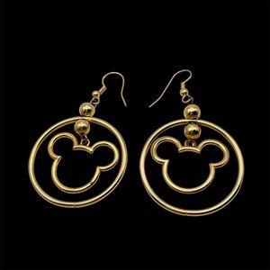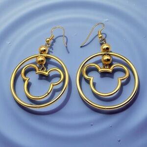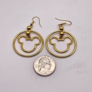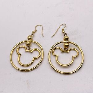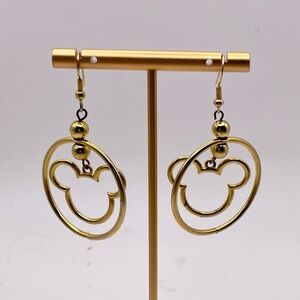 For your consideration is a pair of gold tone Mickey Mouse dangle pierced earrings. They feature gold tone Mickey Mouse silhouettes in a circle. So cute!