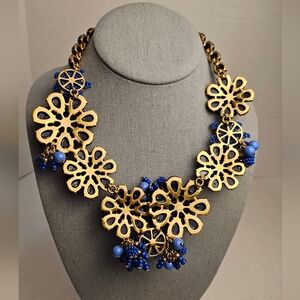 This stunning necklace features intricate blue floral designs, perfect for adding a touch of elegance to any outfit. The deep blue tones are beautifully complemented by gold accents, making it a versatile piece for any occasion.