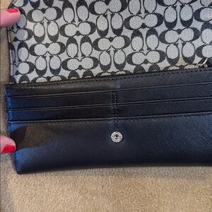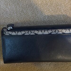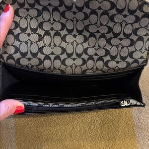 Sleek black leather wallet by Coach. Features a classic design with a secure closure. Ideal for everyday use.