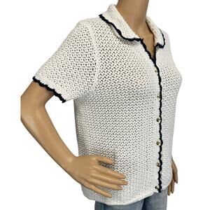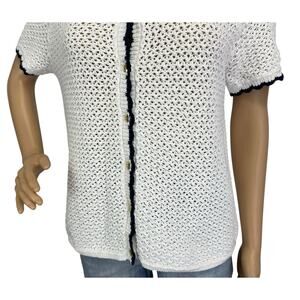 J. Crew Short Sleeve Crochet Cardigan Sweater, Ivory & Navy, Size M. Style CJ215.