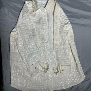 Stylish ivory shirt with croc-embossed texture. Ideal for casual outings. Please refer to photos. There is a slight mark on the upper back collar. This is ivory not white the AI model photos just there for a reference. Good American sizing is different. A size one is typically a 4 to 6 in American sizes which would be a medium approximate. A5-55