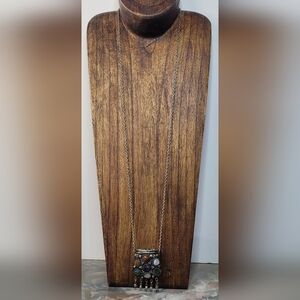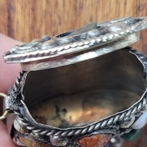 Vintage silver toned metal medicine pouch/coin purse necklace featuring a stunning array of colorful semi-precious genuine stones.