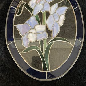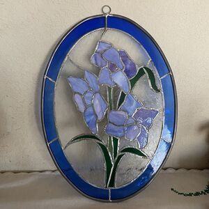 Vintage Handcrafted Large Stained Glass Suncatcher With Iris Flowers. No Cracks!