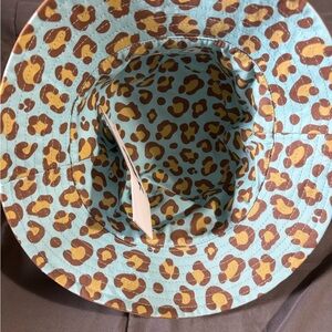 Stylish bucket hat with leopard print. Aqua background with tan spots. Perfect for a bold look. Reversible from Leopard to Tan. Brand new