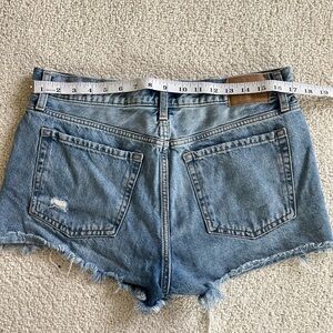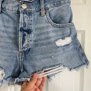 Trendy distressed jean shorts. Frayed hem and classic design. Ideal for casual wear.