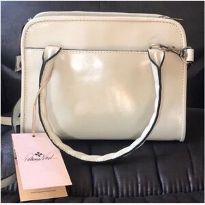 This unique purse is a stunning winter white with glimmering flaked metallic and rhinestone studs. Has double carrying straps with 6" drop and a removable adjustable shoulder strap. Zip top opening with front and back slip pockets with magnetic closure. Interior has soft tan material with a zip pocket and two slip pockets.