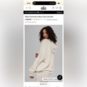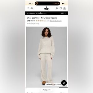 ALO Yoga Wool Cashmere New Class Hoodie & Pants Set. Worn 3x, like new condition. Unattached tags available if requested. Extremely warm set! Cashmere collection. XS top, S bottoms.