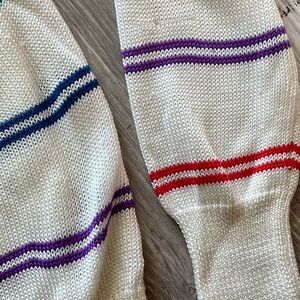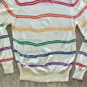 Vintage 1980s e.v. ltd. Rainbow Striped V-Neck Knit Sweater, Tag Size 42, Medium based on measurements (below), some small snags throughout—shown in last two photos