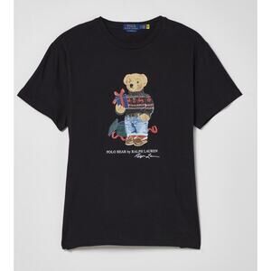 Show off your love for all things classic with this black Polo Ralph Lauren Polo Bear T-Shirt in size Large. The short-sleeved shirt features a crew neck and is made of comfortable cotton jersey fabric, making it machine washable for easy care. The shirt's solid pattern is accented with a graphic print of the iconic Polo Bear and the Polo Ralph Lauren logo.