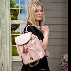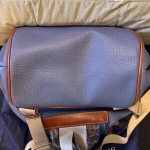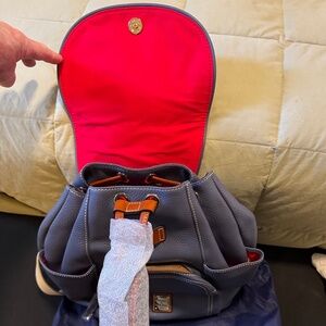 Dooney red fabric lining, zip/slip pockets, inside key keeper.