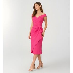 Hot Pink Off Shoulder Wrap Dress Midi Knee Length Ruffle Side Tie Party Cocktail