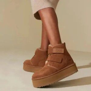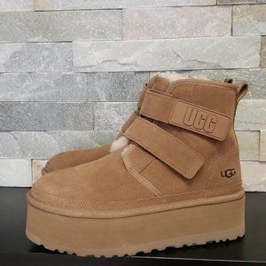 New in box⬆️see pictures Color Name: Chestnut 1130554 Reimagining our timeless chukka for a bolder look than ever before, this Neumel reaches new heights with a leg-lengthening 2" platform – offering easy on and off with hook-and-loop straps. Crafted rich suede, it's lined in our iconic sheepskin with an UGGplush™ insole for signature softness. Suede upper Rear pull tab Suede strap 17mm UGGplush™ 80% upcycled wool, 20% lyocell lining EVA midsole 2" platform height UGG® graphic on strap, Heat-embossed UGG® logo