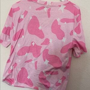 Stylish pink tee with white accents. Features a unique graphic design. Perfect for casual wear.
