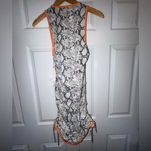 Sleek snakeskin print bodycon dress by Daily Practice, Anthropologie’s elevated active/lifestyle label. Features ruched sides with adjustable drawstrings so you can customize the length and silhouette. Finished with bold orange contrast trim for a modern, sporty edge.