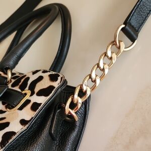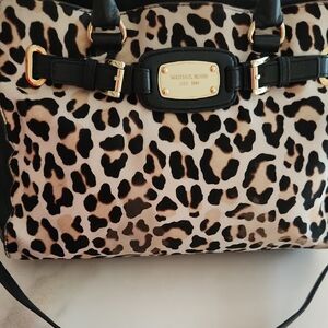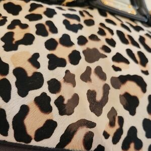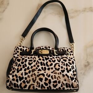 Chic MK satchel featuring bold leopard print accented with sleek black handles and gold hardware. the front features actual hair. Very rich looking.