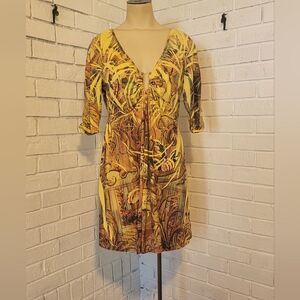 This is a vibrant and unique dress from APT. 9. The dress features a bold, abstract print in shades of gold, brown, and turquoise. It has a flattering V-neckline with a metal hook closure and a ruched, elasticized waist that creates a comfortable, fitted silhouette. The sleeves are a bracelet length, perfect for transitioning between seasons.