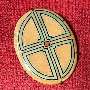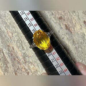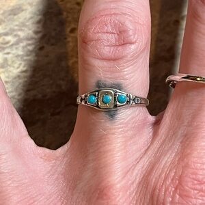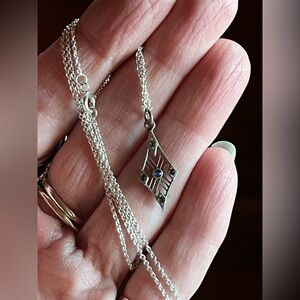 The pendant is not stamped nor signed but has been tested to confirm it is sterling silver has a blue gem which I don’t know if it is glass or gemstone then there are little stones I don’t know what color if they are supposed to be dark color or they are just darkened due to age either way this is a gorgeous piece I wore it for long time I never took it off. The chain is not stamped but clasp is replaced looks to be if I’m not mistaken I believe it is sterling but I could be wrong as the chain is untested but you could always change the chain it’s on. Measurements are shown in above photo for chain and pendant