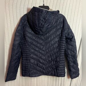 Chic dark blue puffer jacket. Lightweight and cozy. Features a stylish quilted design.