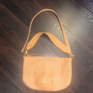 Stylish woven hobo bag by Clare V. Features a tan leather design. Comfortable shoulder strap. Perfect for everyday use.